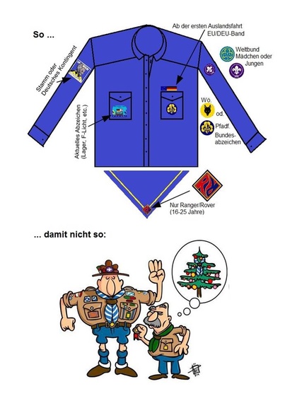 Du brauchst nicht zu überlegen: Ohhh...was zieh ich da an... > Nein, unsere Kluft und unser Halstuch gehören zu unserer Tradition. Hierdurch werden keine sozialen Unterschiede sichtbar und eine einheitliche Grundausstattung geschaffen. Allerdings hat dann jeder selbst noch die Chance der persönlichen Gestaltung. Ob ich meinen Namen aufsticke oder kleine Gadjets anhefte, ist ganz mein Ding. ABER LIEBE ELTERN: Ganz im Gegenteil zur Kluft, darf das Halstuch niemals gewaschen werden. Denn in den Wicklungen des Halstuches befinden sich die Erinnerungen eines ganzen Pfadfinderlebens. Einzige Ausnahme ist ein gemeinsames Bad in Seen oder Flüssen- da darf es dann auch nicht fehlen. Übrigens: Fragt Eure Stammesführung wegen einer Sammelbestellung oder Gebrauchtwaren an. Da spart man dann auch noch einige Euro`s.