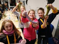 Ganz schön schleimige Sache… Rezepte gibt es ja viele. Wir haben Slime hergestellt aus wasserlöslichem Klebstoff, Lebensmittelfarbe, Glitzerstaub, Kontaktlinsen-Flüssigkeit und Flüssigwaschmittel. Hierbei galt es, den Mengenbedarf ganz alleine herauszufinden. Und es sind tolle Ergebnisse dabei herausgekommen. Wer denkt, man ist damit in 10 Minuten fertig, der irrt aber gewaltig. Hier ist eine Stunde Experimentierfreude gewiss.